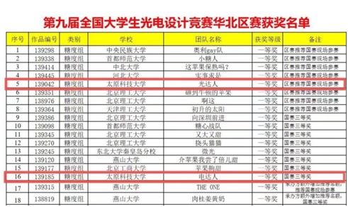 由我校应用科学学院教师邱选兵、李传亮及郭古青指导的“光达人”和“电达人”两支学生队伍代表我校参加了本次竞赛。经过方案展示和实物现场PK的激烈角逐。由伍和鹏、韩锴锴、王虎组成的“电达人”队伍获得华北赛区一等奖;由马成聪、刘博、智晓龙、王进组成的“光达人”队伍获得华北赛区一等奖并晋级全国总决赛。