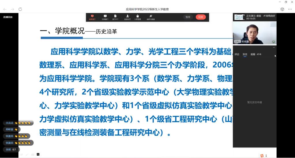 为了使2022级新生能够更好地适应大学生活,及时完成角色转变,增强自我教育、自我管理和自我服务的能力,2022年9月4日下午3时,我院通过企业微信平台以线上直播的形式,组织开展了2022级新生入学教育活动。学院党委书记彭英、院长林金保、副院长李晋红、杨斌鑫、团委书记王志社、辅导员李刚和全体2022级新生参加了本次活动。本次活动由学院副院长杨斌鑫主持。