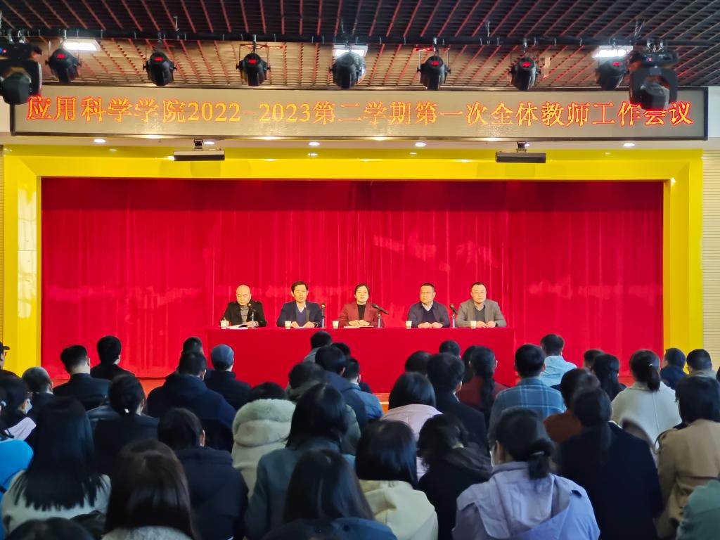 为全面做好新学期各项重点工作,3月1日下午3时,应用科学学院在校团委学生活动中心召开了2022-2023学年第二学期第一次工作会议。学院领导班子成员、各系教学、科研主任以及全体教职工共计150人参加了会议。会议由杨斌鑫副院长主持。