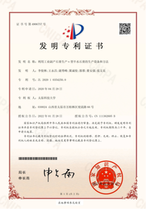 (1)利用工业副产石膏生产α型半水石膏的生产设备和方法,ZL 2020 1 0354250.0,2022.01.28