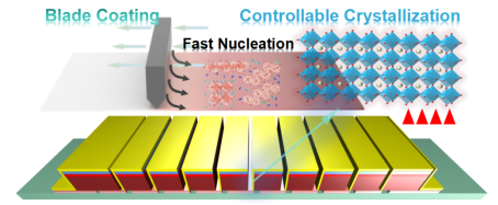 大面积钙钛矿太阳能电池组件的高效性和稳定性对于这一光伏技术的产业化至关重要。然而,实现大面积高质量钙钛矿薄膜的可控制备仍然具有挑战性。鉴于此团队深入研究了由2-甲氧基乙醇(2ME)、N,N-二甲基甲酰胺(DMF)和N-甲基-2-吡咯烷酮 (NMP)组成的三元溶剂体系,以微调甲脒铯(FACs)钙钛矿前驱体溶液的溶解度、挥发性和配位特性,从而延长溶液涂覆的加工时间窗口,并促进后续退火过程中的晶体生长。利用优化的溶剂体系,成功制备了高质量、大面积的反式钙钛矿薄膜。基于单一NiO空穴传输层的反式钙钛矿太阳能电池组件,其孔径面积分别为100.15 cm²和2123.18 cm²,认证效率分别为18.73%和14.62%。此外,在1和0.5倍太阳等效白光照射下老化1000小时后,封装的微型模组和子模组在最大功率跟踪下仍分别保持了97.2%和95.8%的初始效率。