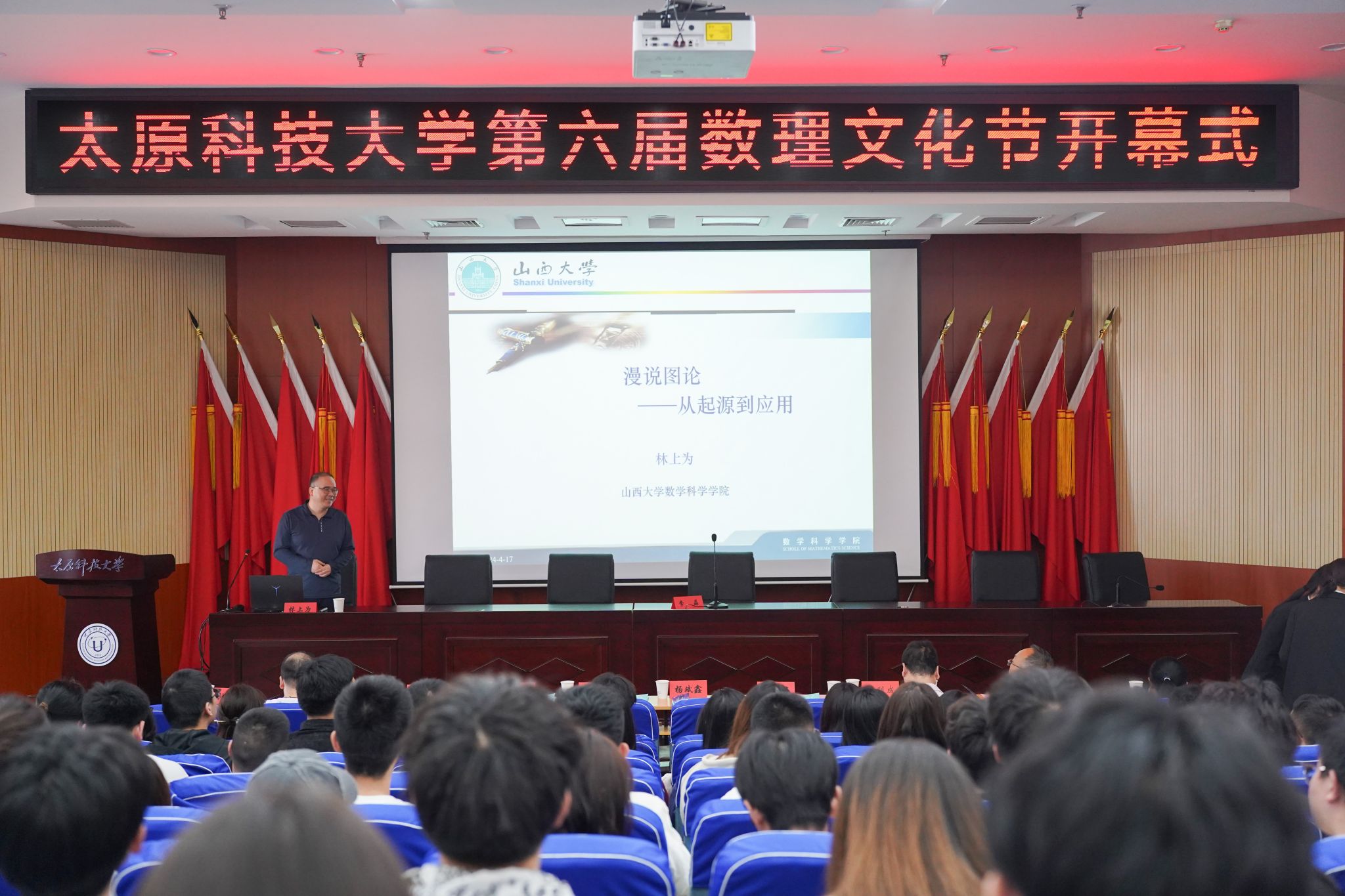 2024年4月17日下午,由太原科技大学学生工作部主办、应用科学学院承办的“漫说图论——从起源到应用”人文素质报告暨数理知识科普讲座在图书馆六层报告厅举办,报告特邀山西大学数学系林上为教授主讲。应用科学学院2022级、2023级200余名学生参加了此次报告会。