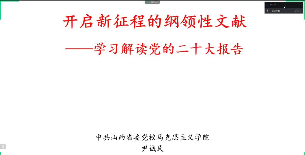 11月9日下午,应用科学学院邀请山西省委党校马克思主义学院尹诚民教授做了题为“开启新征程的纲领性文献——学习解读党的二十大报告”的线上报告。学院二百余名党员参加了此次主题党日活动,本次活动由学院党委书记彭英主持。